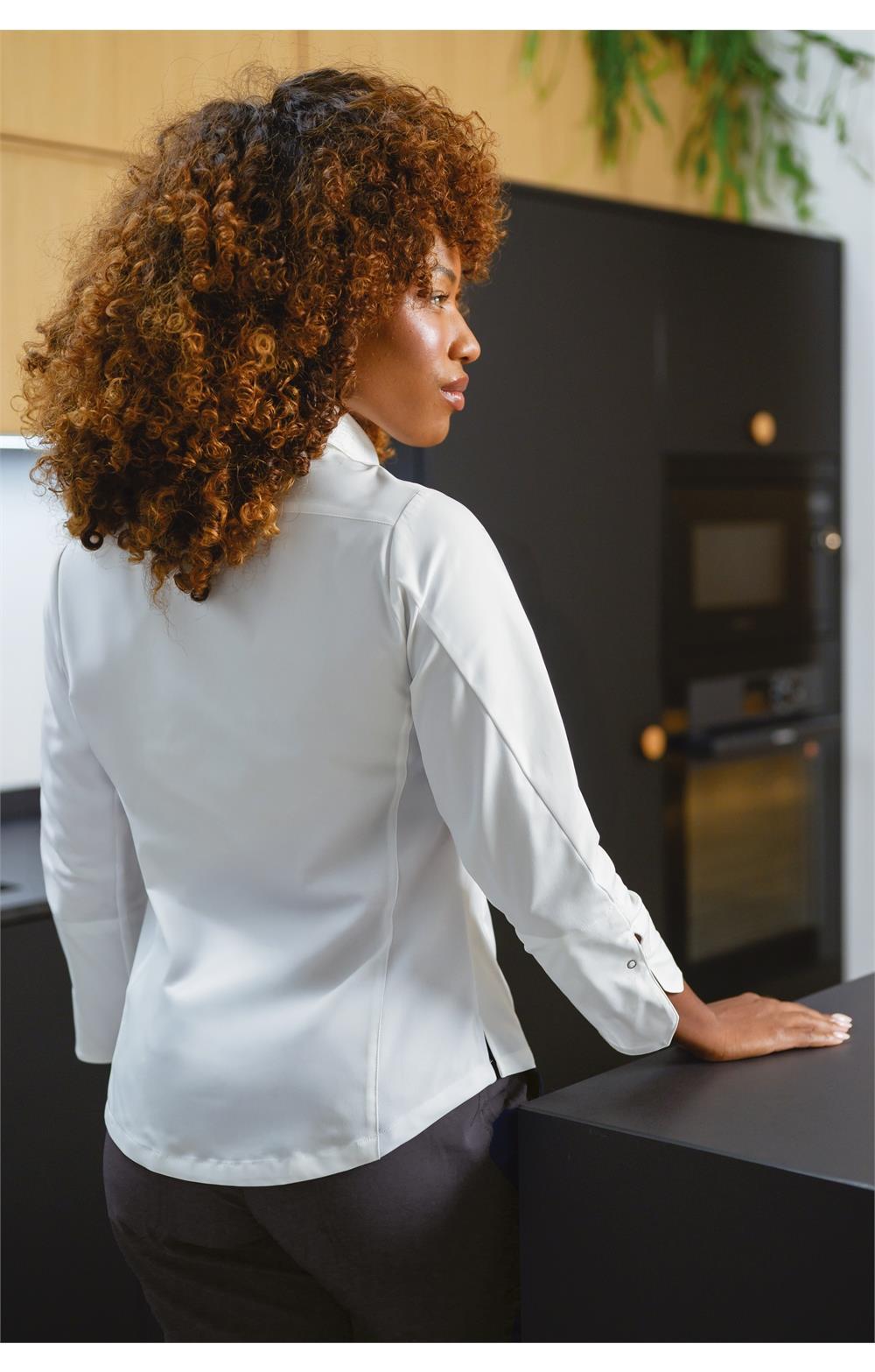Costadillos transpirables. Broches en puño. Broches centrales ocultos y bolsillo con vivo en manga. Trabilla en cuello
