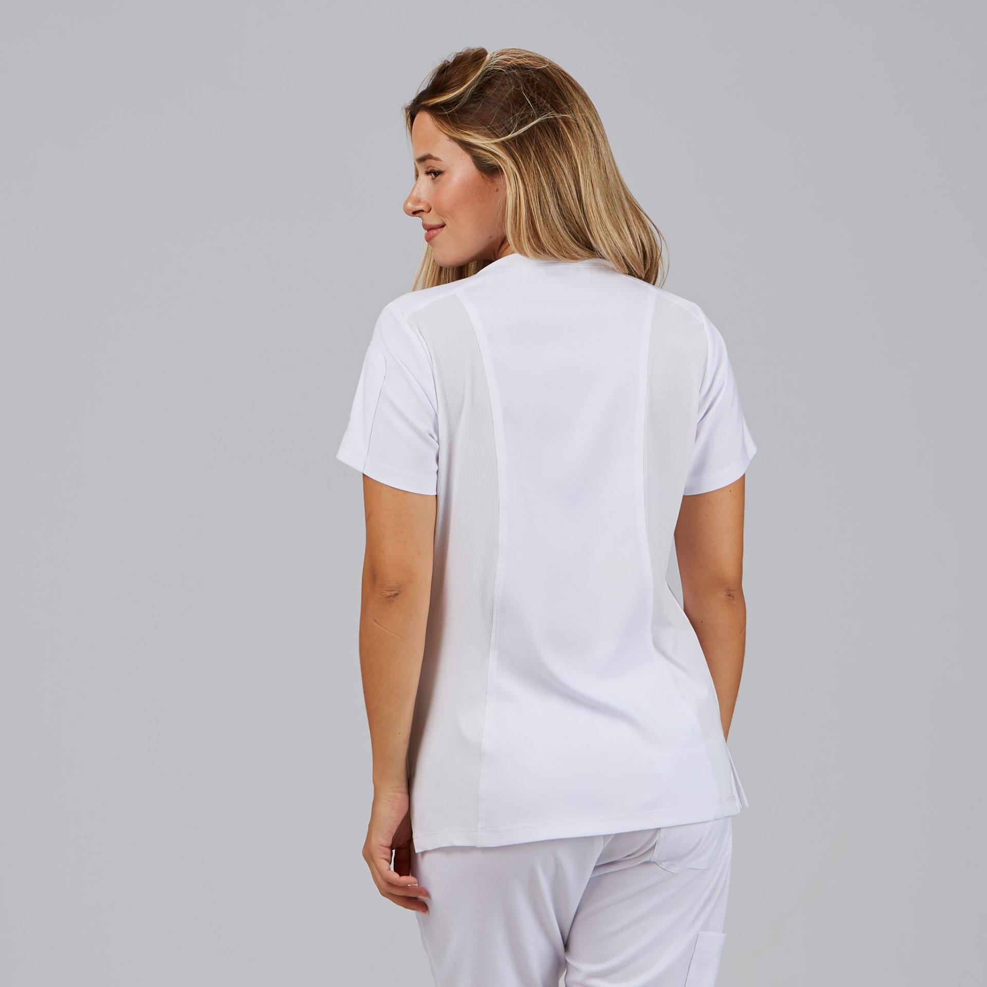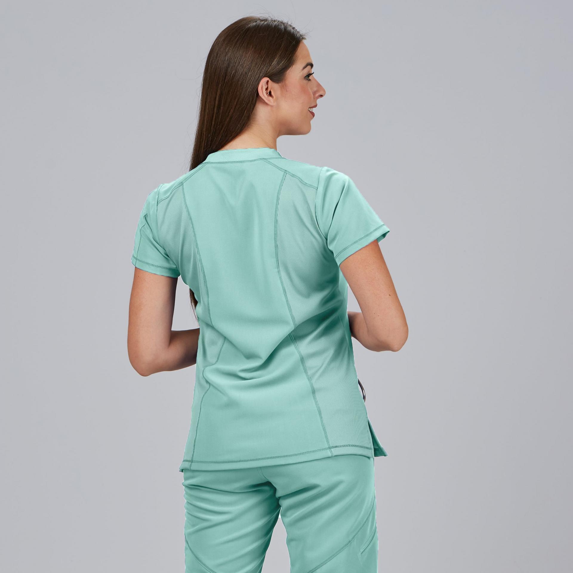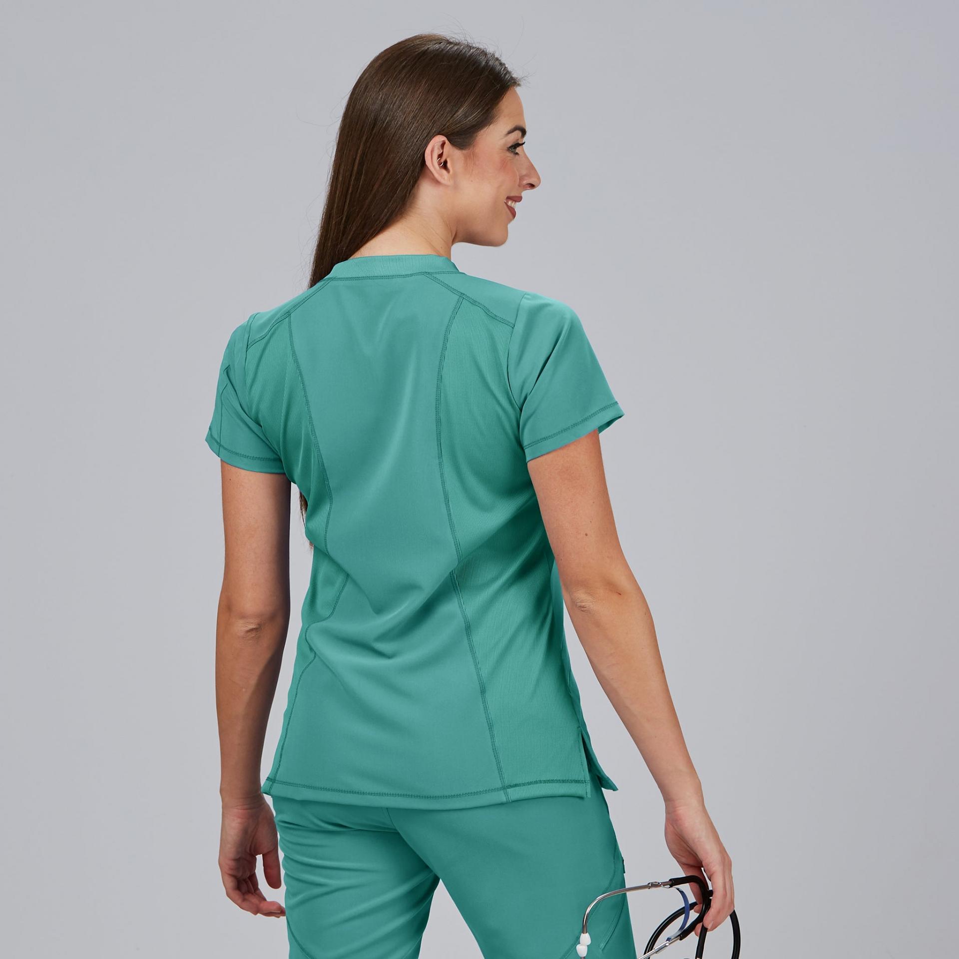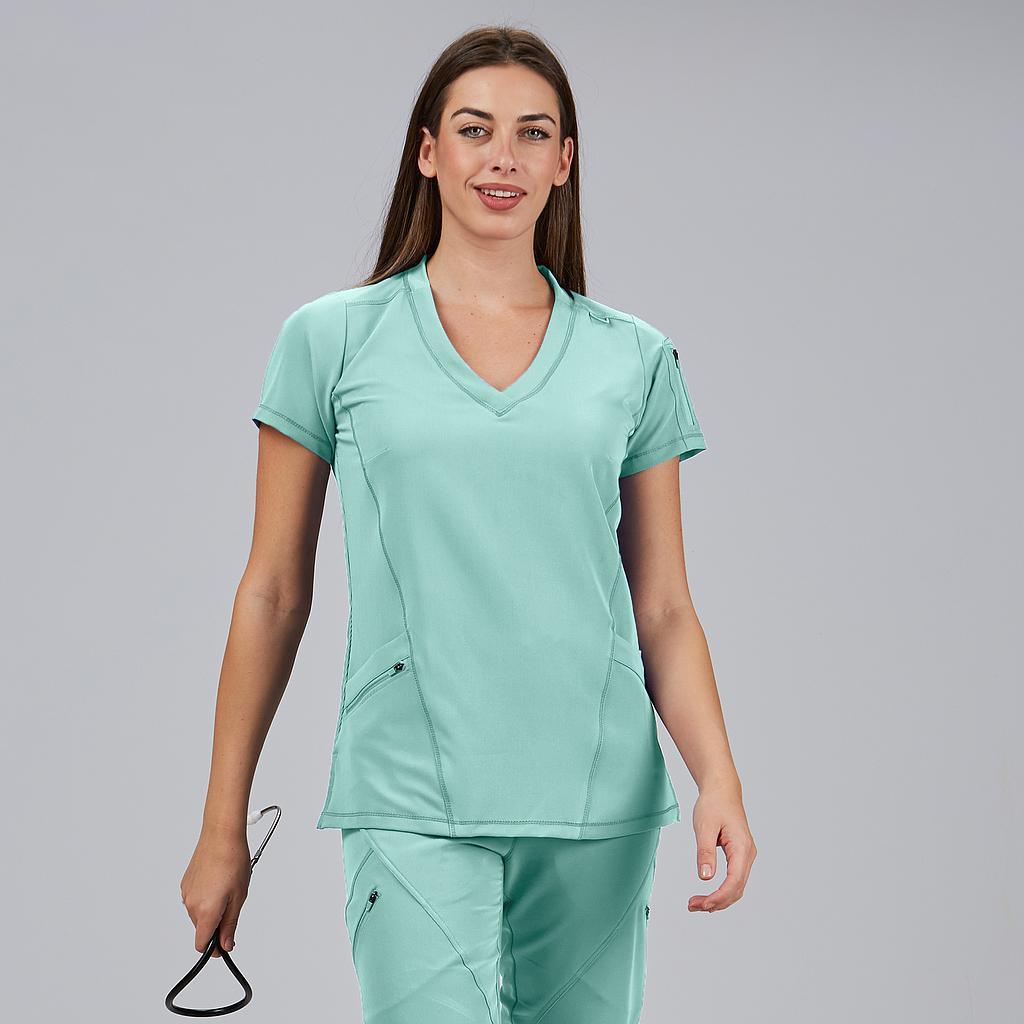 La Blusa Mujer Cuello Canalé M/C NANCY es una prenda profesional que combina comodidad, diseño moderno y tejido sostenible, ideal para mujeres que trabajan en sanidad, clínicas, farmacia, estética o laboratorios. Su corte semi ajustado (M2) y su largo de 67 cm aprox. proporcionan un ajuste ergonómico y favorecedor para el día a día.