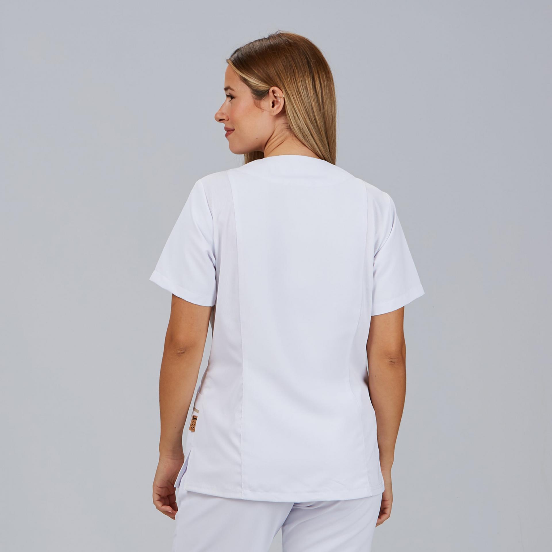 El diseño incorpora un escote en V con bies a contraste, manga corta y un original cierre asimétrico con botones de presión, que aporta un aire contemporáneo. Los costadillos traseros en tejido canalé mejoran la movilidad, mientras que los costadillos frontales en tejido principal aportan estructura al diseño.