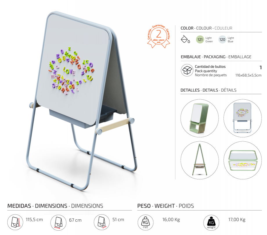 - Mecanismo abatible que facilita su almacenaje dentro del aula.