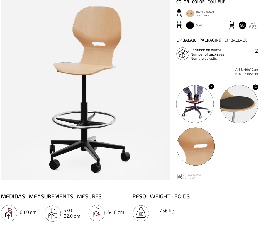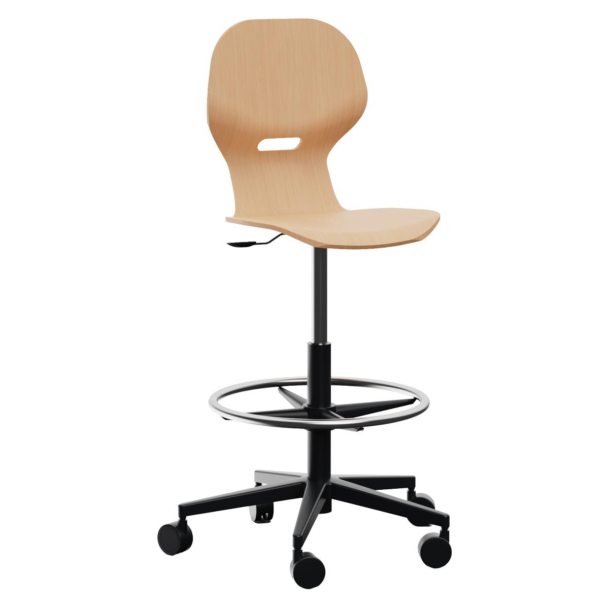 Taburete alto giratorio escolar con respaldo curvado para un confort óptimo. Fabricada en madera resistente, con base en forma de estrella con reposapiés, y equipada con ruedas que aportan movilidad y versatilidad. Incorpora orificio trasero para facilitar su manejo.