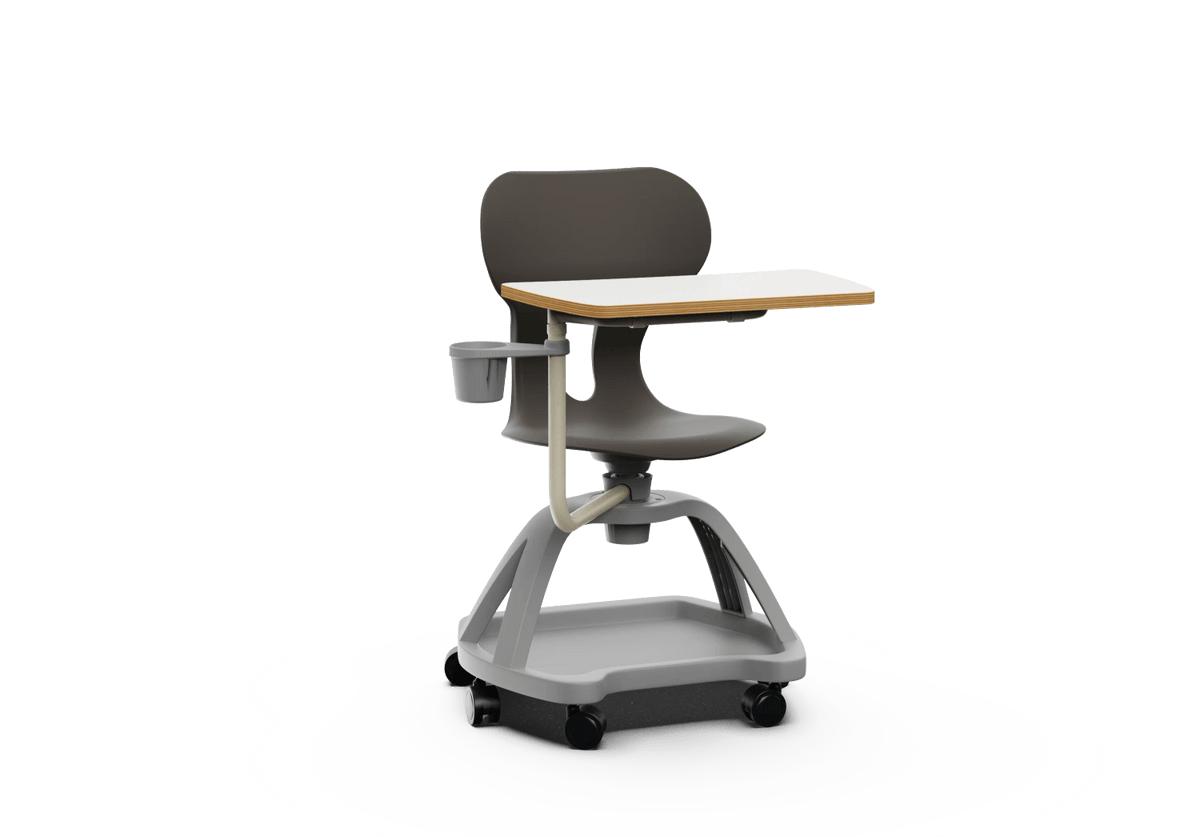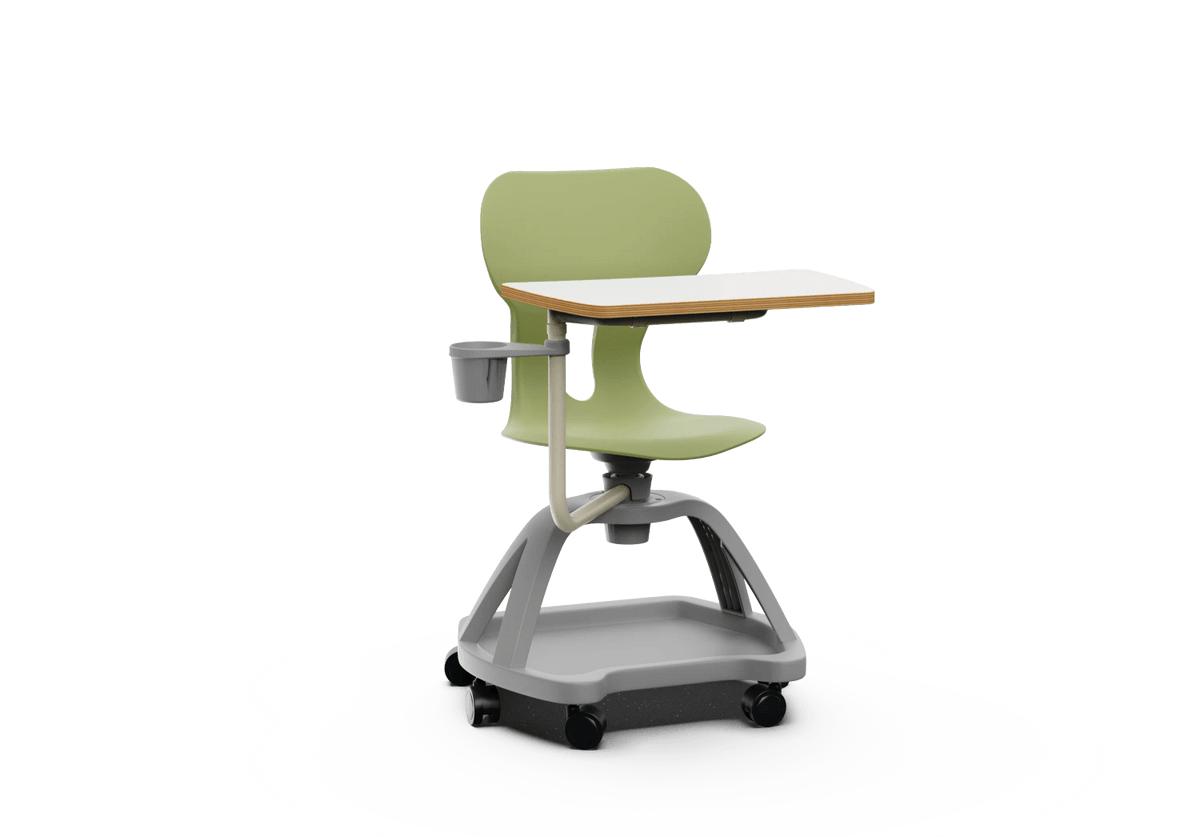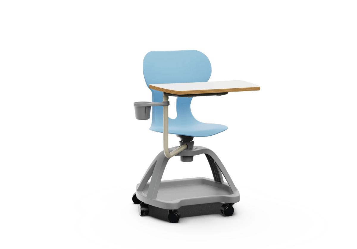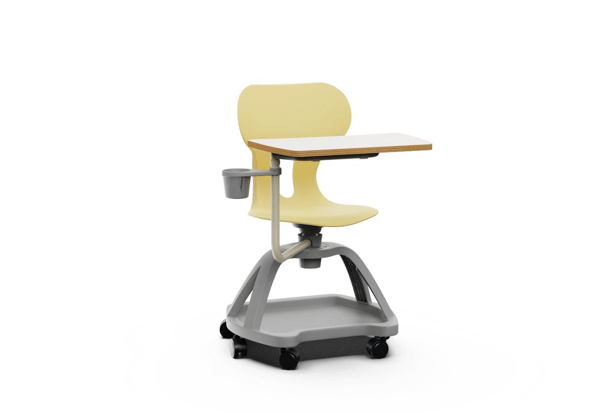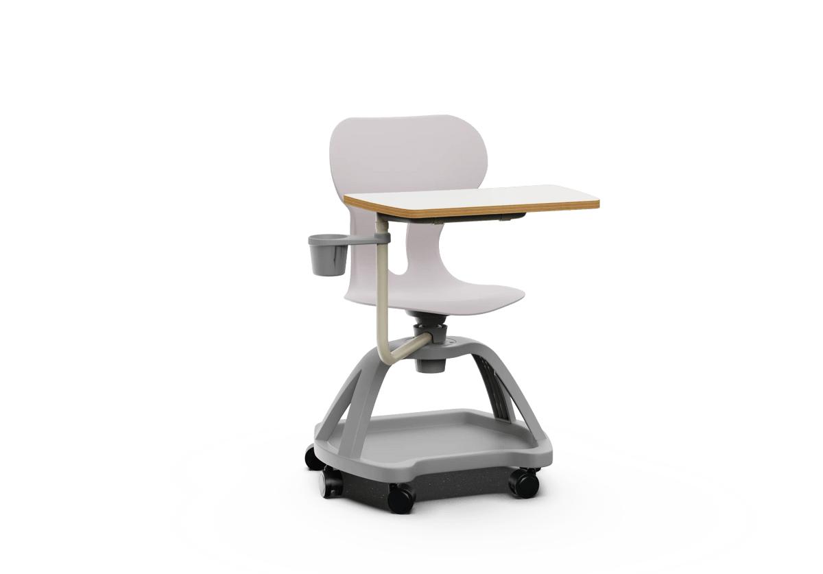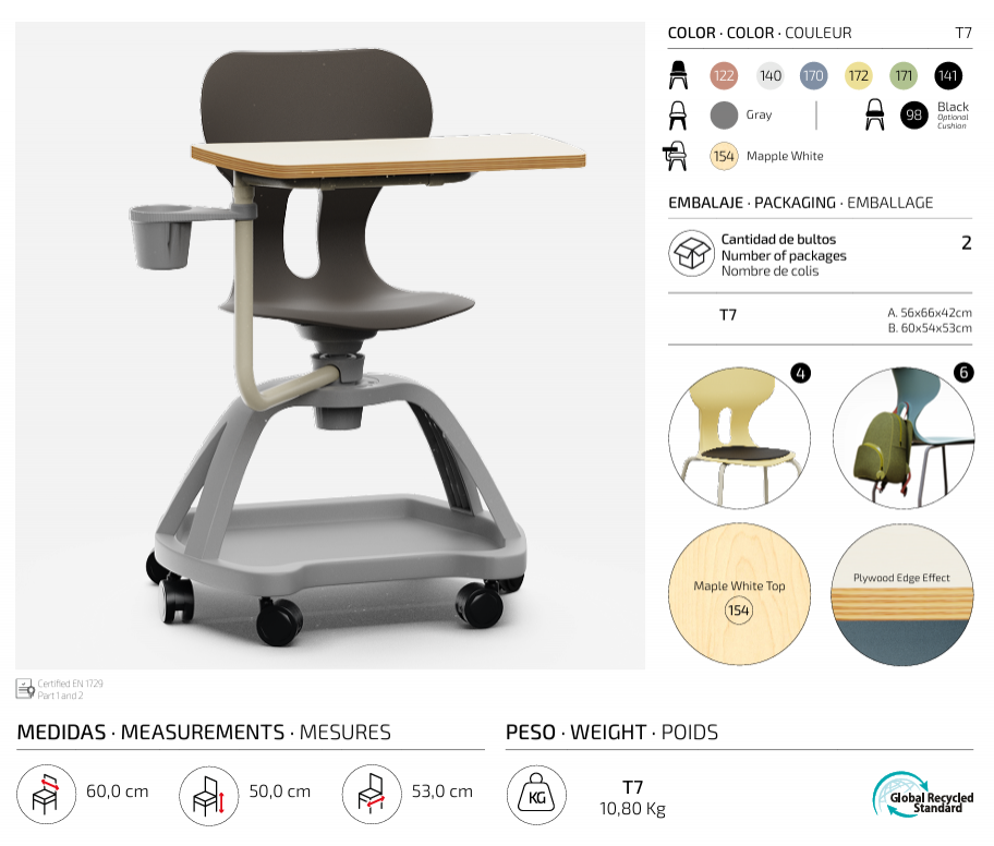 Silla giratoria escolar con respaldo curvado para un confort óptimo. Fabricada en polipropileno reciclado, equipada con ruedas, una práctica bandeja inferior, una mesa abatible con giro de 360° y un soporte para bebidas. Incorpora un agujero en la parte trasera del respaldo para colgar la mochila, facilitando el orden en el aula.