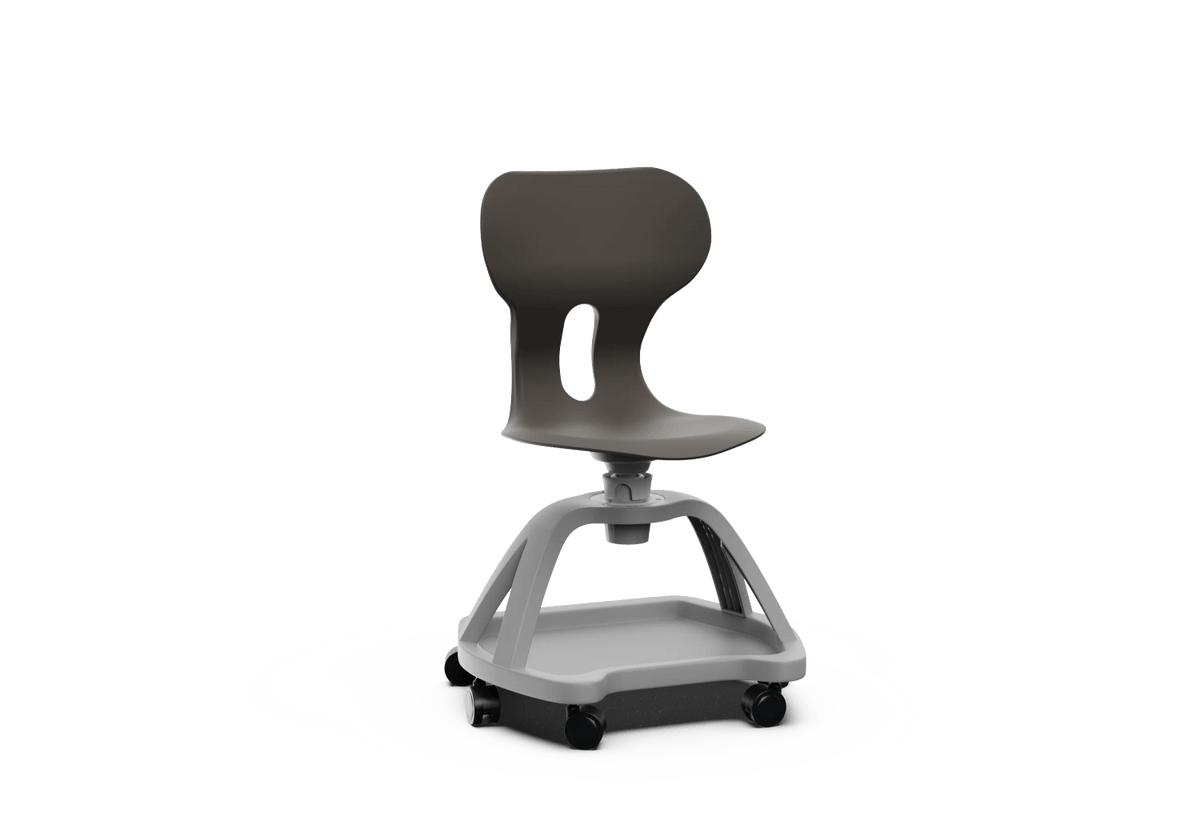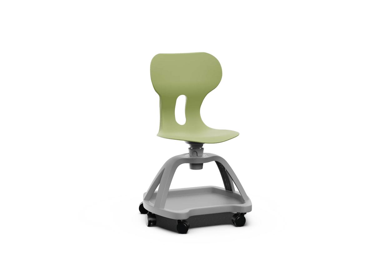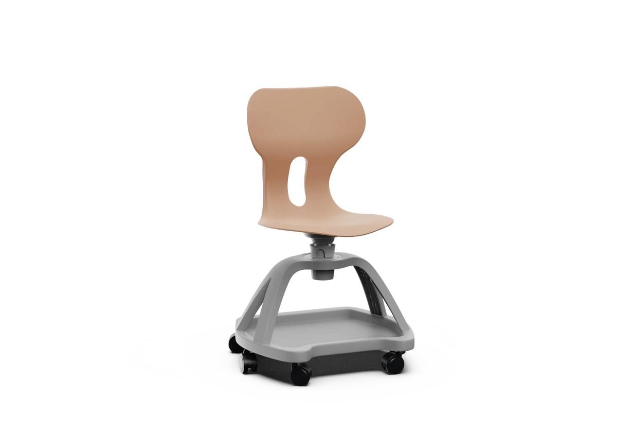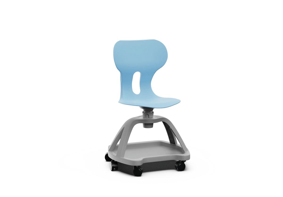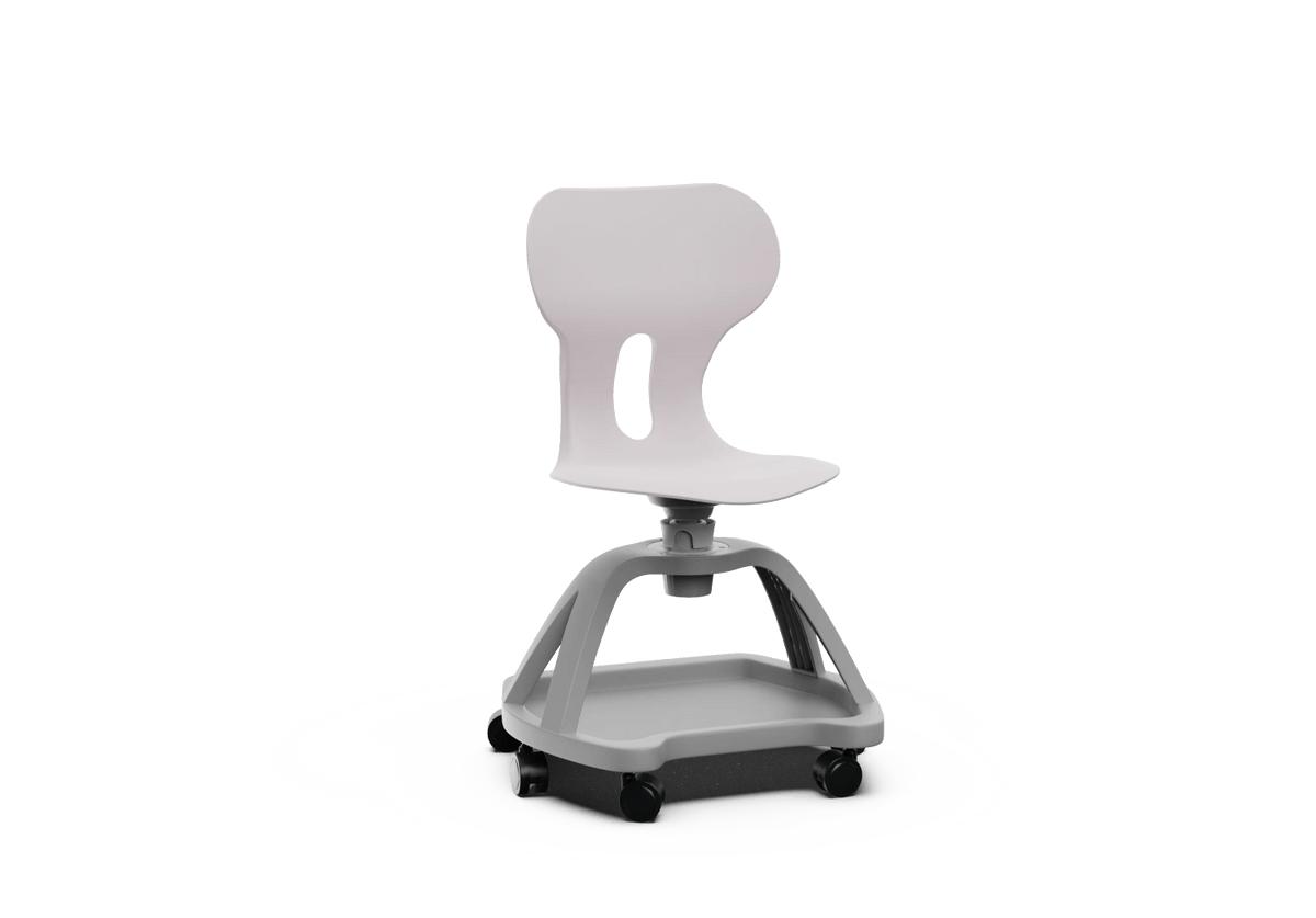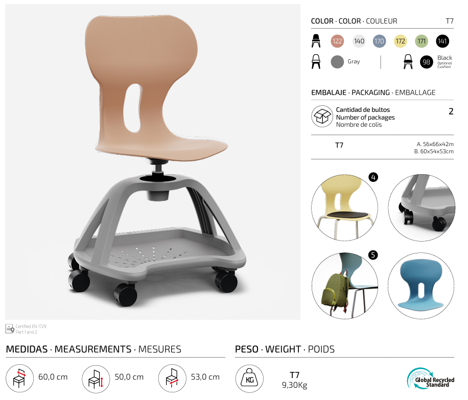 Silla giratoria escolar con respaldo curvado para un confort óptimo. Fabricada en polipropileno reciclado, equipada con ruedas y una práctica bandeja inferior. Incorpora un agujero en la parte trasera del respaldo para colgar la mochila, facilitando el orden en el aula.