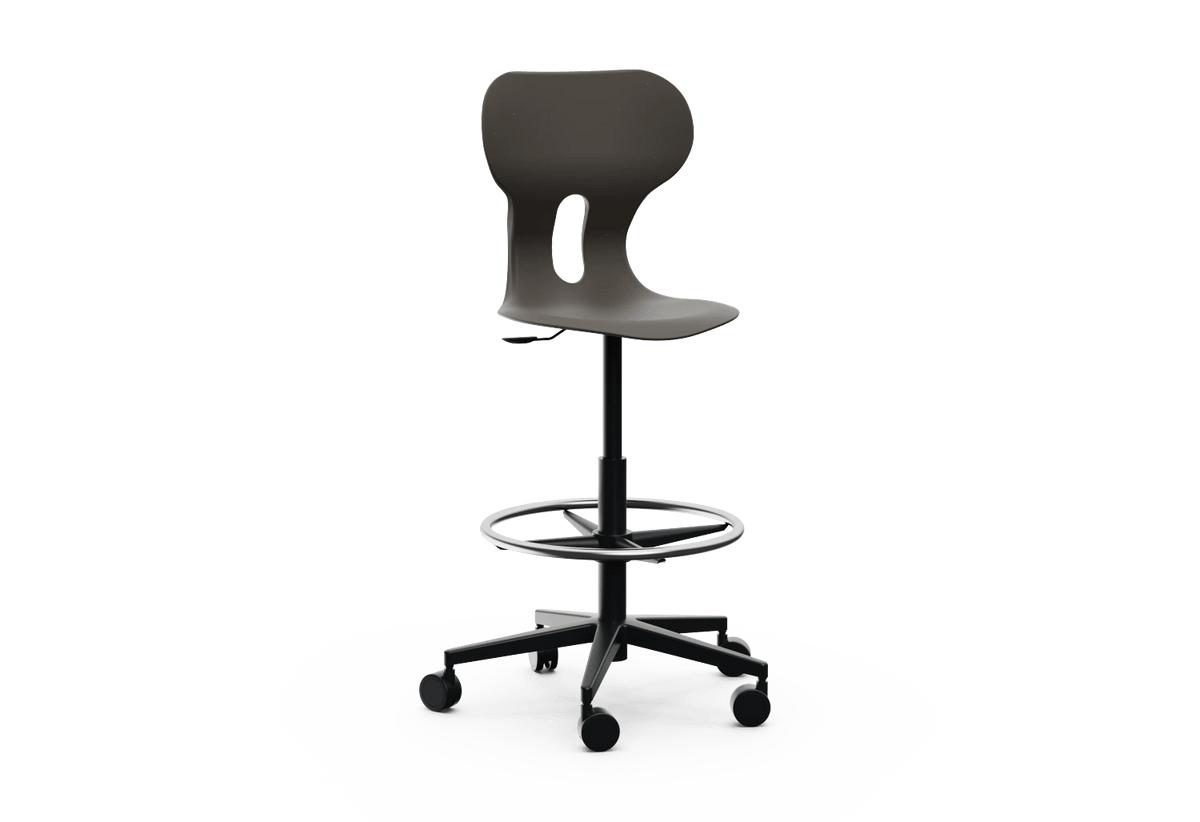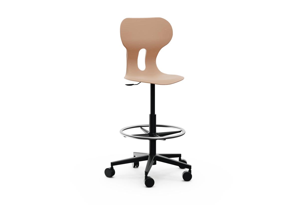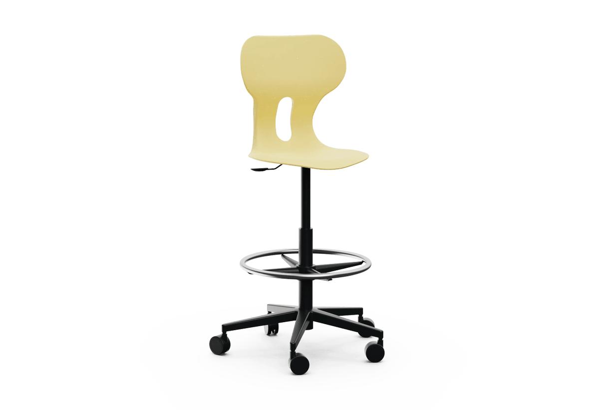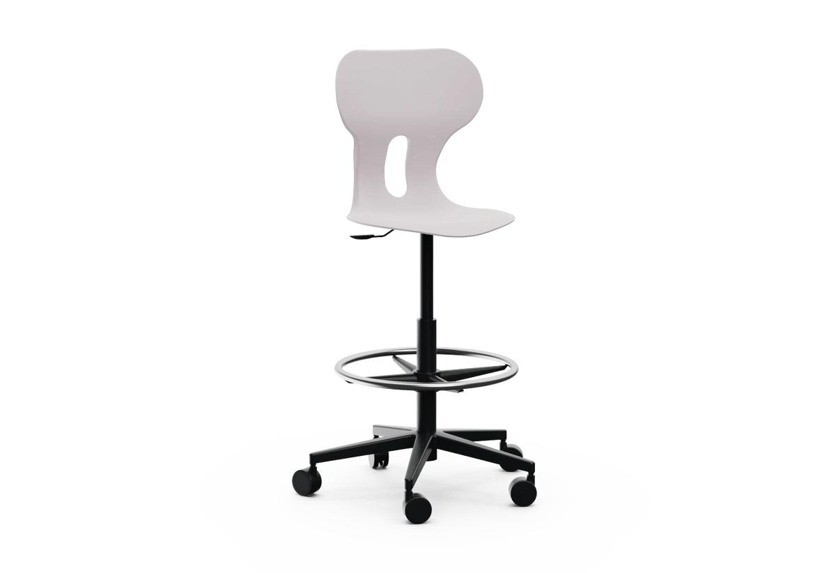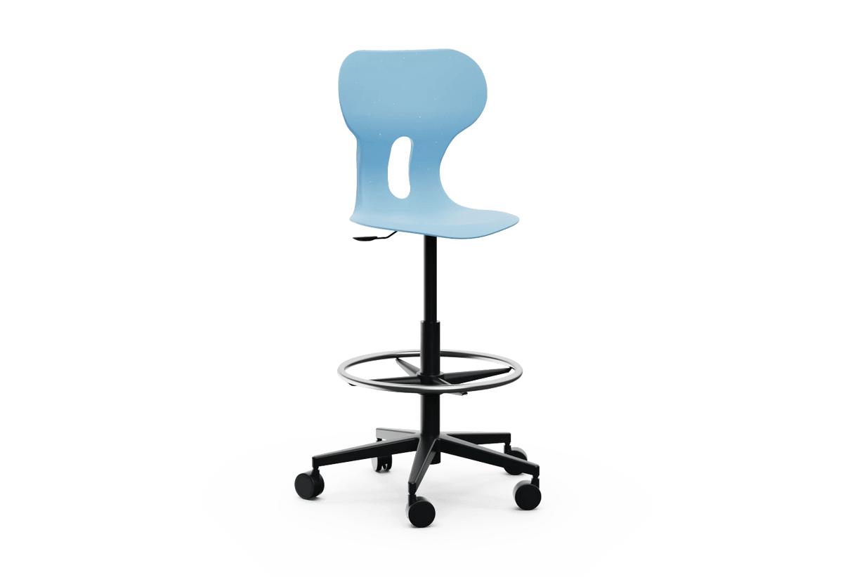 Taburete alto giratorio escolar con respaldo curvado para un confort óptimo. Fabricada en polipropileno reciclado, con base en forma de estrella con reposapiés, y equipada con ruedas que aportan movilidad y versatilidad. Incorpora un agujero en la parte trasera del respaldo para colgar la mochila, facilitando el orden en el aula.