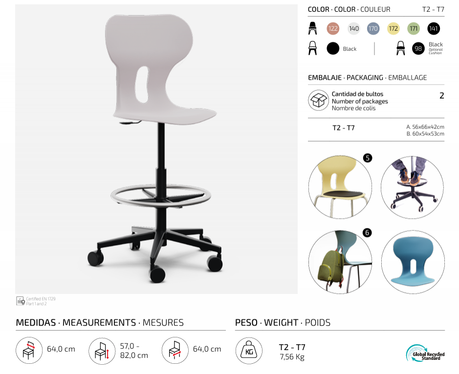 Su diseño funcional y resistente la hace ideal para equipar aulas de aprendizaje colaborativo en centros educativos, así como espacios escolares con mesas altas —como laboratorios o aulas tecnológicas—, o centros de formación.