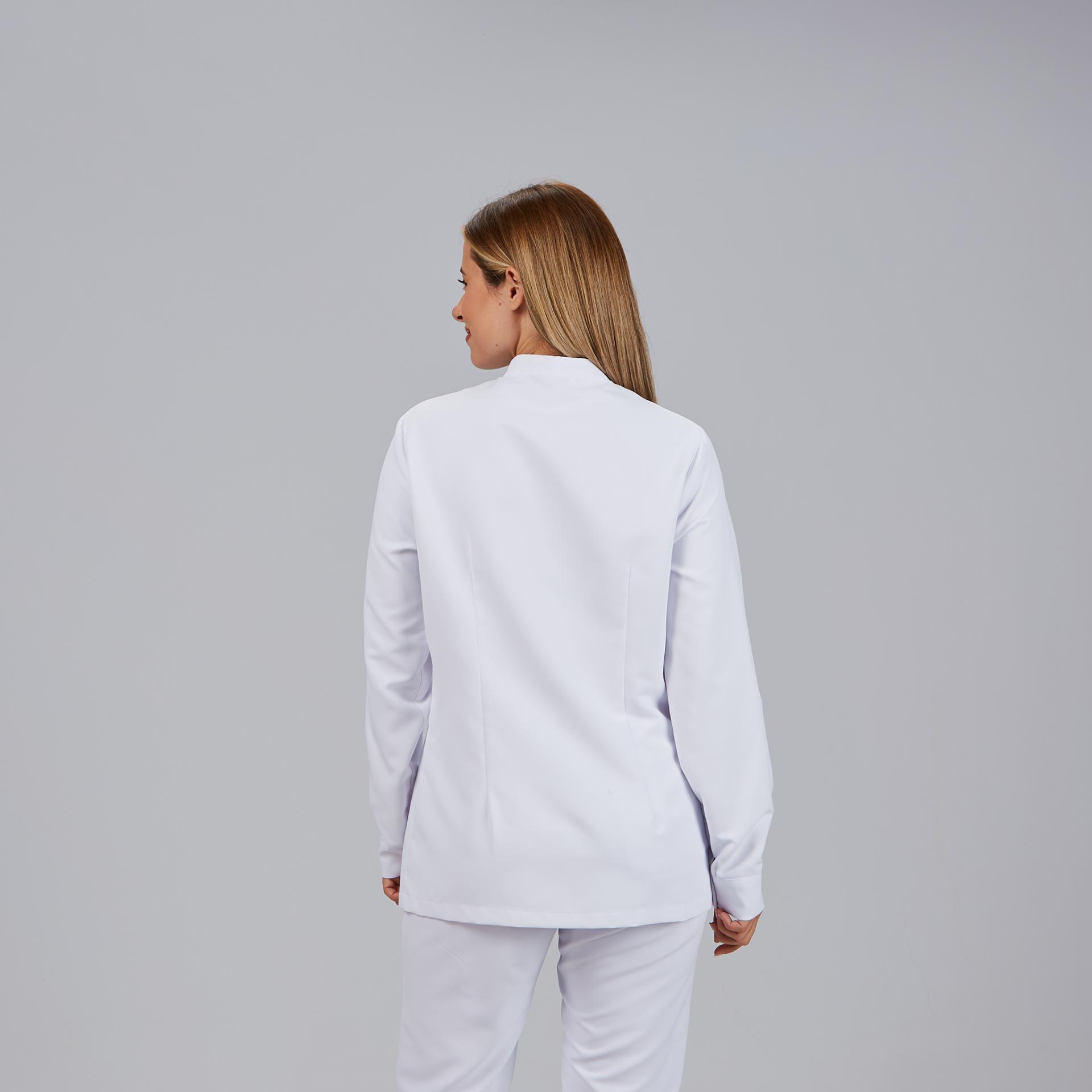 Casaca para mujer en manga larga, con cuello mao, botones de presión ocultos en delantero y puños, dos bolsillos de parche laterales y un bolsillo en pecho izquierdo. Prenda semi ajustada, con costadillos en delantero y espalda. Confeccionada en MICROFIBRA de 100% Poliéster, un tejido antibacterias, altamente transpirable, tolerante a salpicaduras de lejía, lavable a 90º, seca rápido, sin necesidad de planchado y repelente al cabello y pelo de mascotas. Ideal para uniformes de enfermería, doctores y demás profesionales sanitarios en hospitales, clínicas y centros médicos, farmacia, laboratorio, veterinario, estética, spa o comercio. Disponible también en modelo para hombre referencia 613900