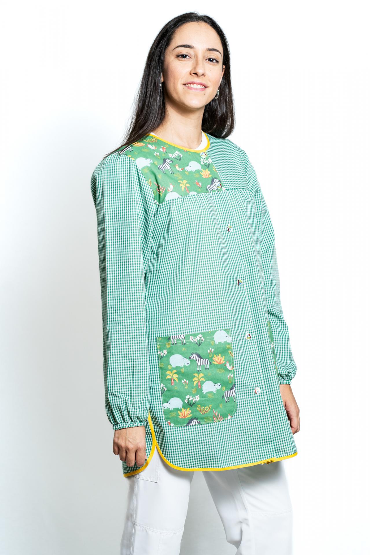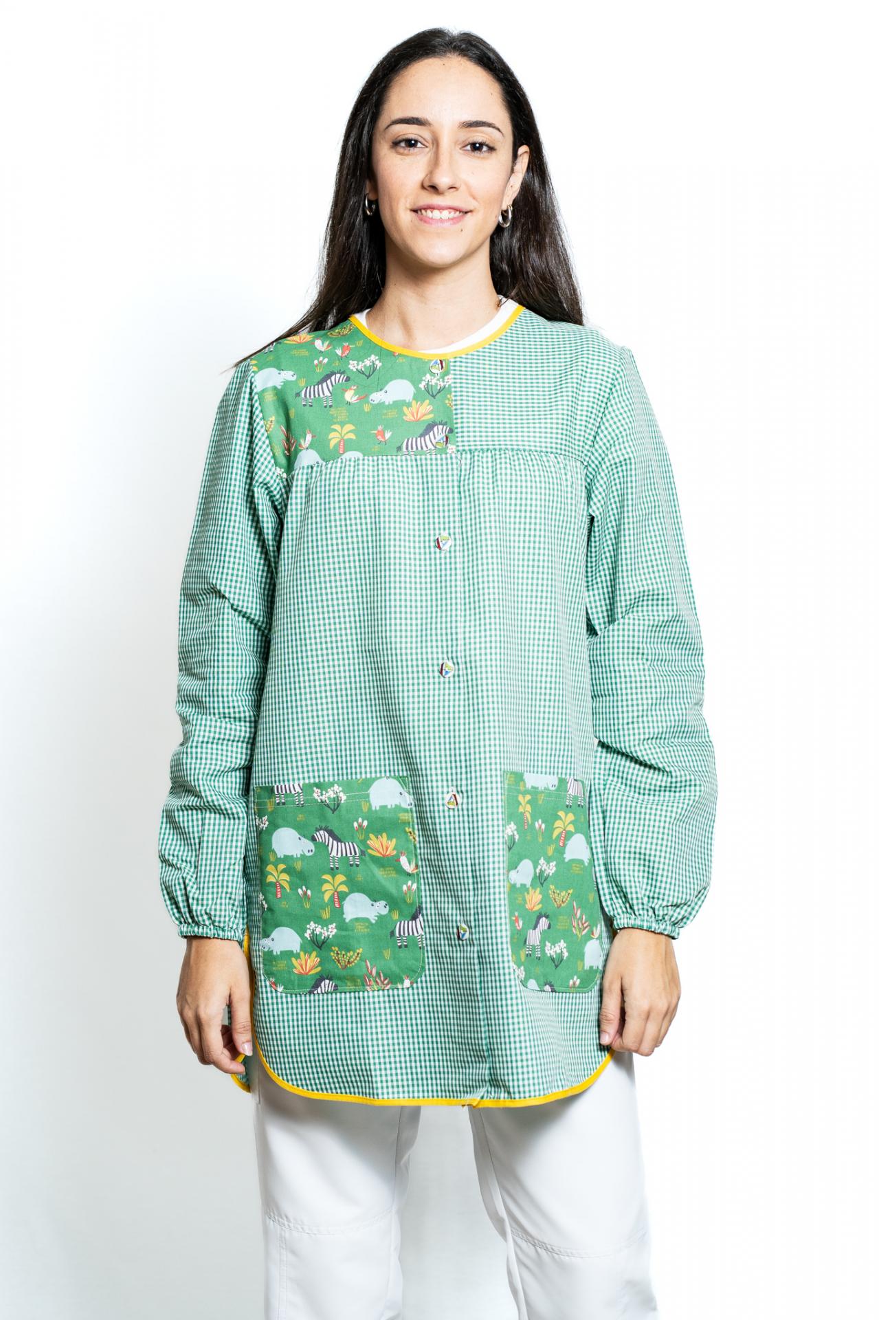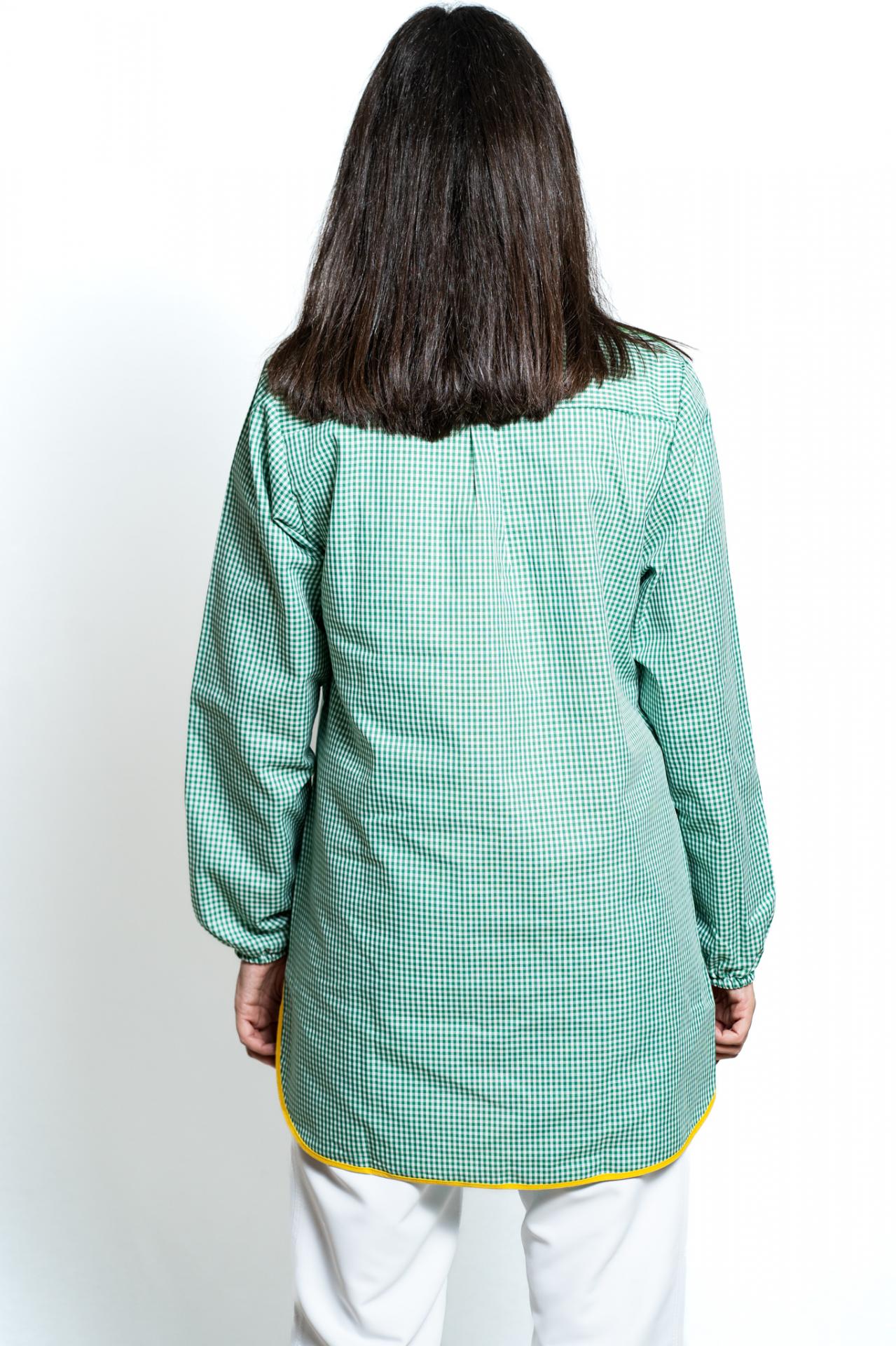 Bata señora, tres cuartos, abierta con botones, escote redondo, dos bolsillos, manga larga con goma, con canesú en delantera y espalda.