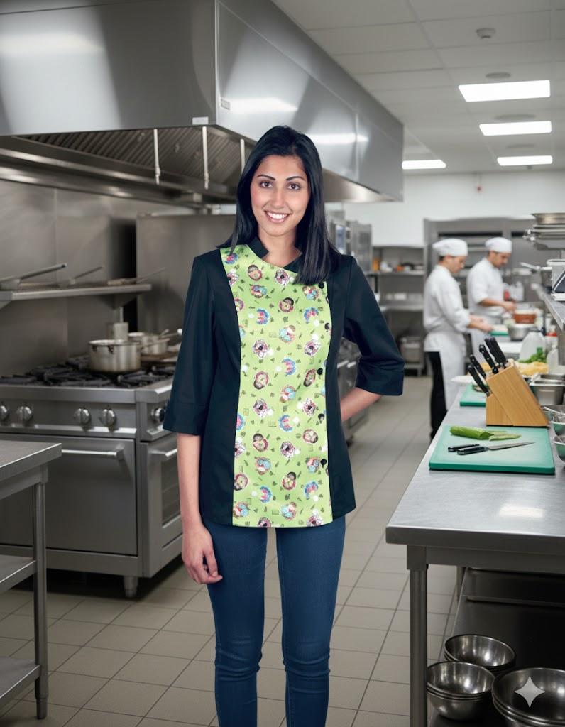 Cerrada, escote en V, tres bolsillos y manga corta.