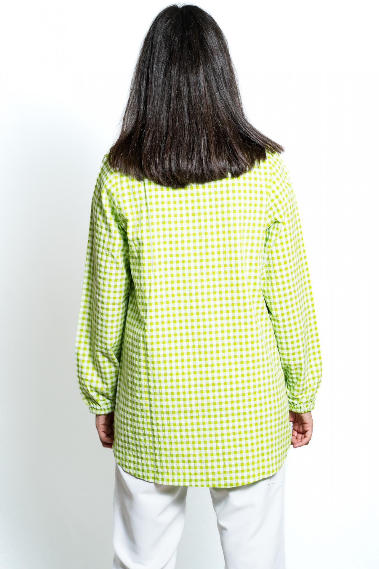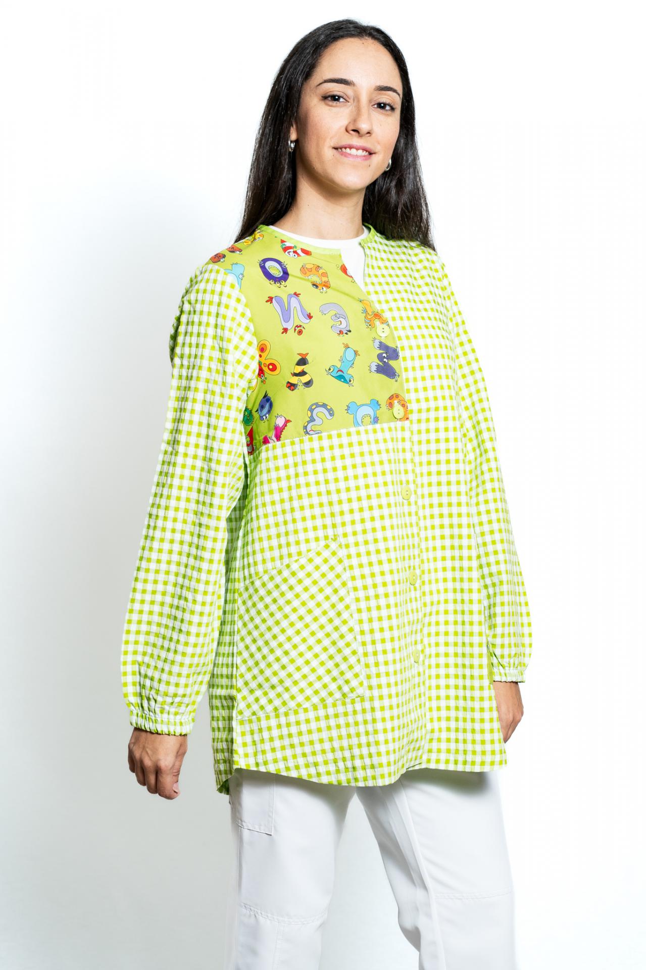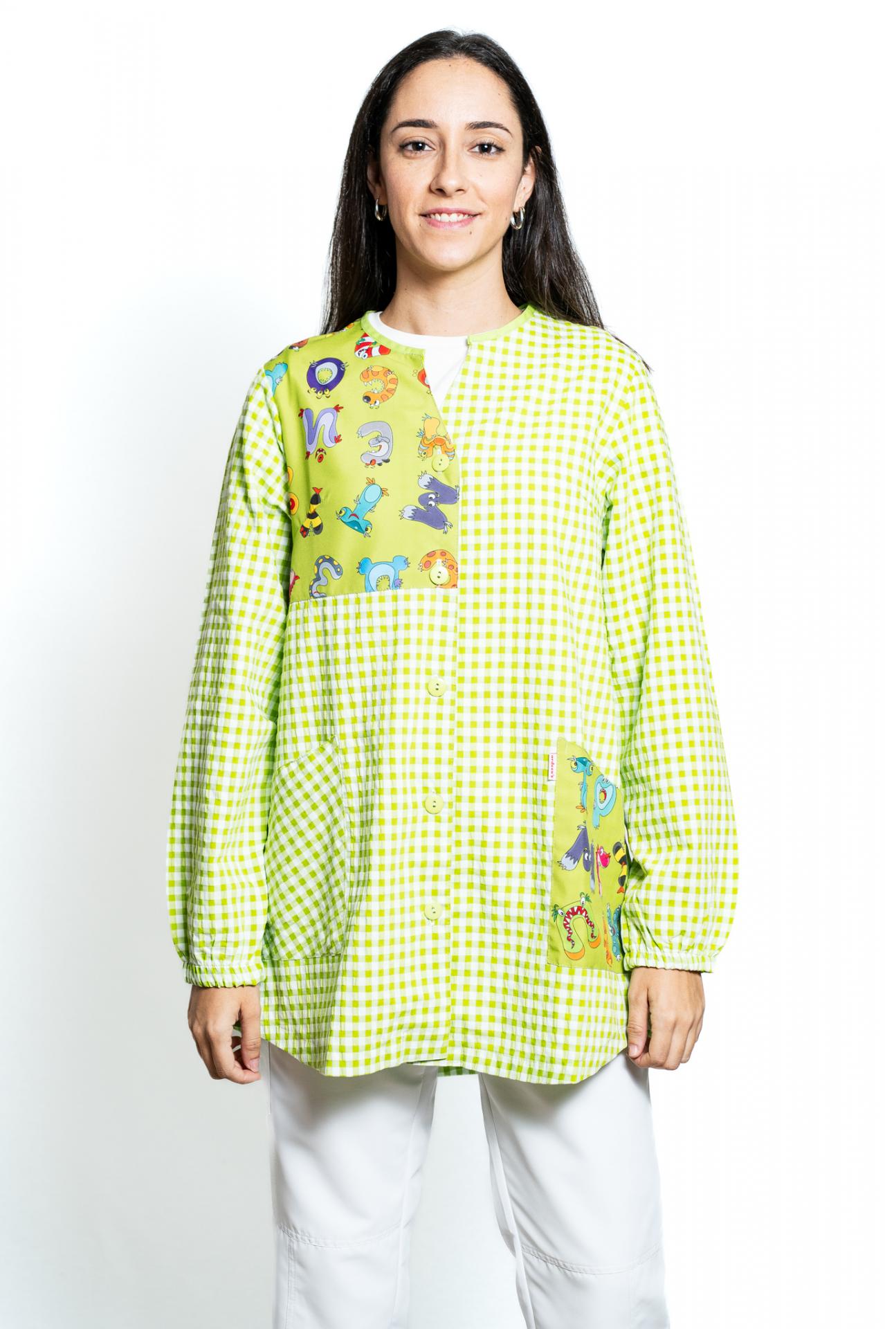 Cuadro verde, bata de manga larga. Combinado con el lado derecho y bolsillo derecho de estampado de letras y números.
